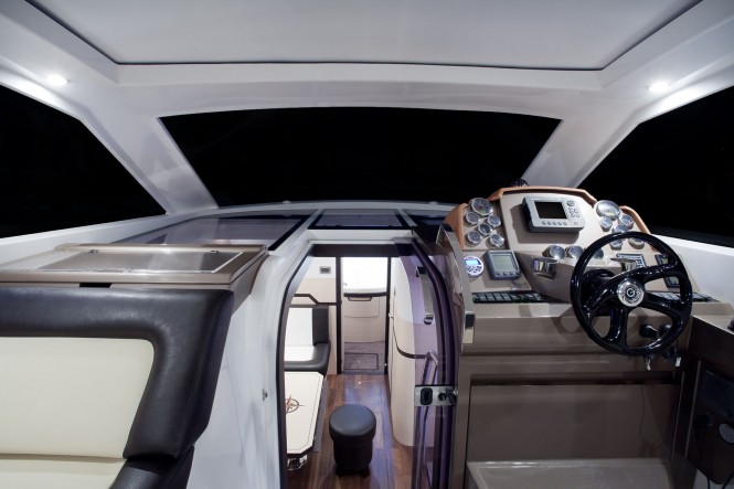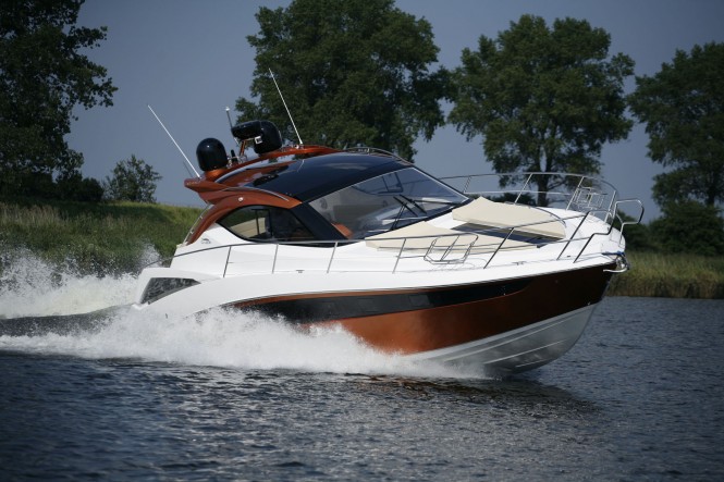 The 385 motor yacht’s garage system comes standard even with the Z- drive and the optional automatic platform can handle up to 400 kilograms of water paraphernalia. The model was recognized and nominated for The European Powerboat of the Year Award by BOOTE magazine.