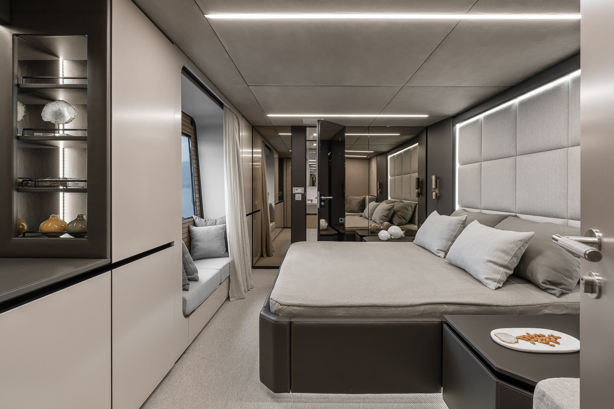 The accommodation sleeps up to 8 guests across 4 well-proportioned en-suite cabins, consisting of 1 Master suite, 2 double cabins and 2 twin cabins. The Master suite comes with a walk-in wardrobe, sofa, drop-down TV above the double bed and a private fold-down terrace.