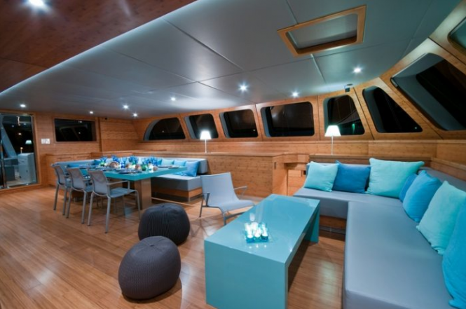 The custom made superyacht CHE features a massive cockpit area where charter guests can relax on one of the many couches. There is a large dining table for al fresco meals, sheltered from the elements by the hard top roof. One level up, a large fly bridge area can be found, with more sun-pads to relax, as well as another large table for dining or enjoying cocktails while watching the deep blue sea beyond.