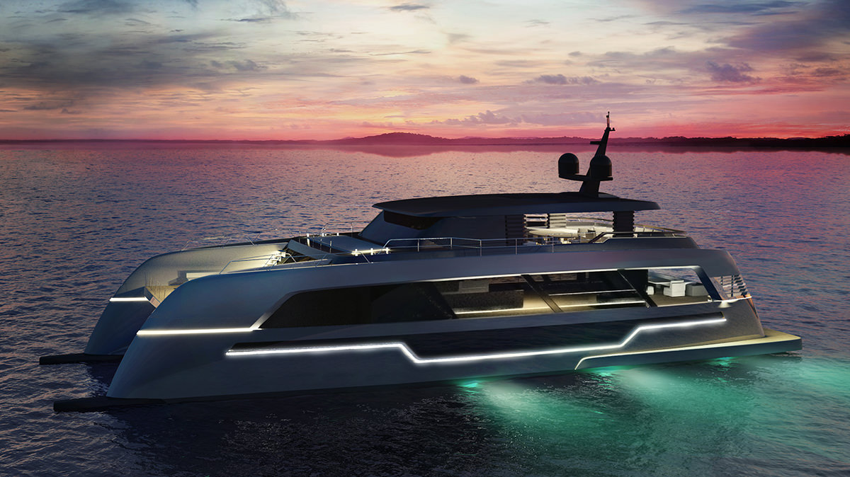 Sunreef 120 Power Catamaran’s lines were inspired by the supercar industry resulting in an elegant and sporty vessel with a number of chrome elements and LED accents.