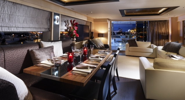 The yacht’s equipment includes a 50” flatscreen TV in saloon, with computer presentation facilities. Flatscreen TVs in all cabins, CD/DVD/Radio iPod docking in all cabins and saloon. Full air-conditioning/heating, Zodiac Yachtline 420 DL tender, sound system fitted throughout the vessel for all-round sound. Flybridge facility for TV and computer presentation.