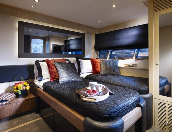Accommodation on board of High Energy is provided in four luxuriously outfitted cabins to a maximum number of eight guests. The cabins include the master stateroom, one forward VIP stateroom and two twin/double cabins. The crew of four highly skilled professionals is accommodated below.