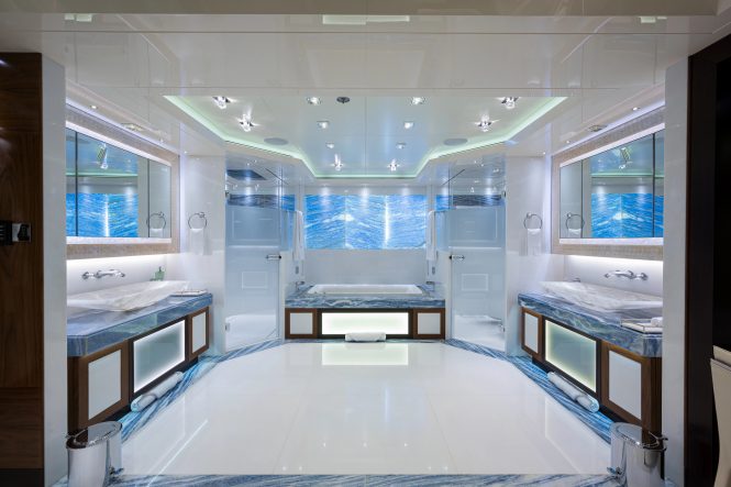 Accommodation is for twelve lucky guests in six out-of-this-world staterooms including a full beam master suite on the bridge deck filling the entire midships area. The huge main bedroom also has a sizeable lounge, breakfast/coffee table, study, his and hers dressing rooms and the most amazing ensuite. The additional guest suits are located forward on the main deck while the crew take up residence on the lower deck. There is clever access between the crew areas, pantry and galley and the guest spaces to allow for ultimate privacy.