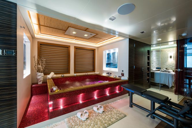 For lovers of pampering treatments, there is a full spa on the lower deck, just above sea level that includes a steam room, spa pool, shower and fabulous treatment room. From here a wide door can be opened which transforms the area into a beach club with direct access to the sea.
