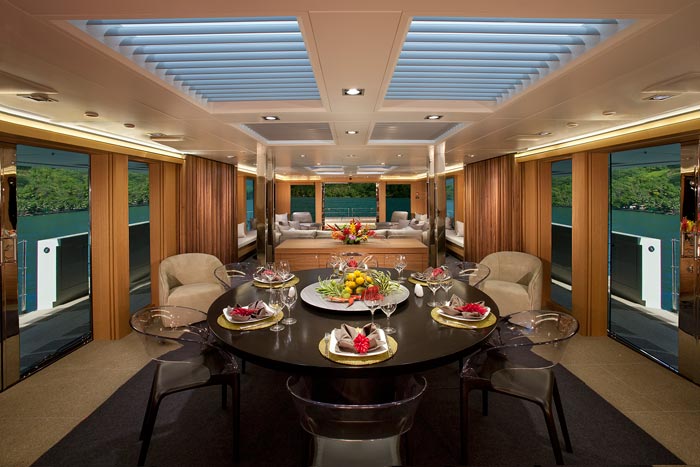 The formal dining area forward of the main salon seats up to 6 guests in elegant simplicity for a dining experience where the company is the focus.