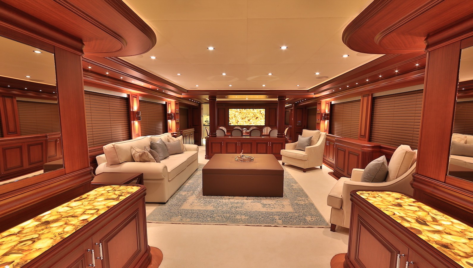 Her beautifully finished interiors feature elegant furnishings in a timeless neutral tone. Rich woods compliment the light fabrics, while bespoke backlit detailing add a sophisticated atmosphere. Her main salon is laid to an open plan with a sumptuous lounge aft and formal dining forward. Included on the main deck and forward, is the full beam master stateroom with 180-degree views. Above on the upper level is a well-appointed sky lounge, which offers ample seating and full entertainment systems.