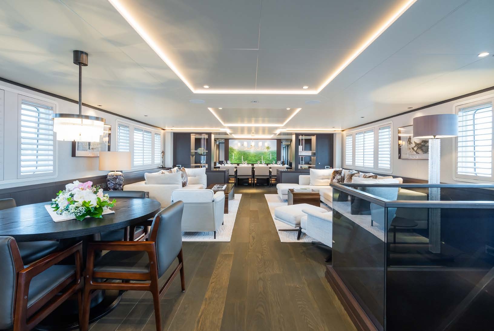 Her three exterior deck levels have been enhanced by a hull extension to offer one of the grandest main deck aft spaces in her class. The sun deck boasts a spa pool, and she carries a full garage of water toys to keep guests entertained.
