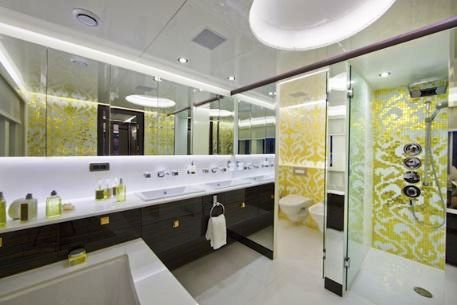 The layout of this yacht is fairly unique with her master suite being situated on the upper deck in the area normally used for the sky lounge. And the usual place for the master suite on a superyacht is on the main deck is replaced by a large gymnasium and a cinema.