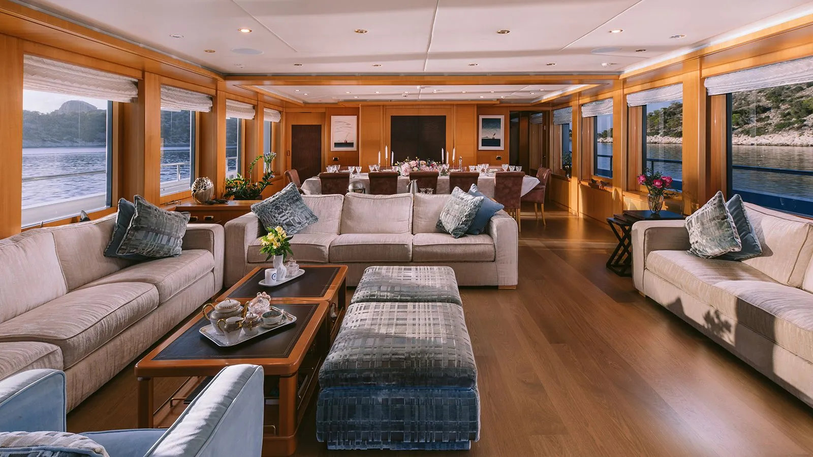With her tri-deck layout and expansive outdoor spaces, OASIS provides a spacious sundeck with a 12-person Jacuzzi and multiple lounging and dining areas. The recent refit included new upholstery in both salon and exterior areas, complementing the yacht’s warm, elegant interiors.