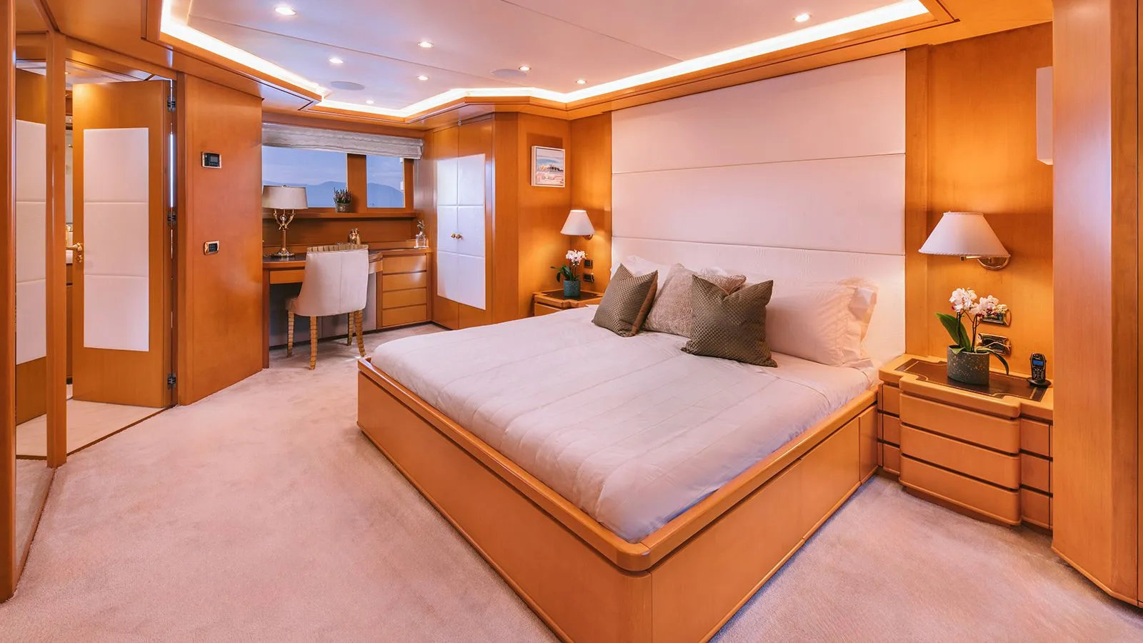 Delivered in 2006 and refitted in 2023, OASIS features classic exterior lines by Walter Franchini and interiors designed by Luca Dini. She offers a versatile cabin configuration with a main deck master suite, upper deck VIP, and four guest cabins on the lower deck, one of which includes a Pullman berth all with en-suite facilities.