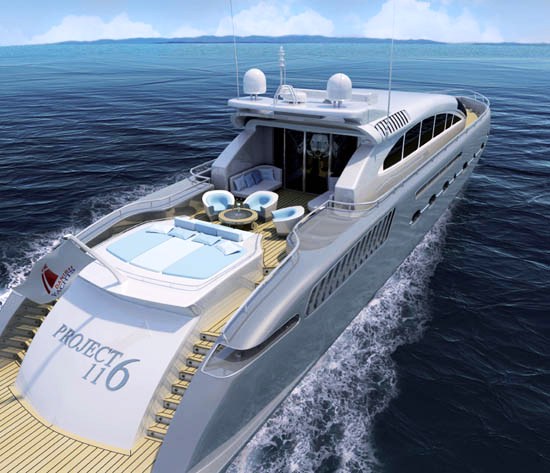 The high speed Superyacht Project 116 has a sleek and sporty design and is set to pioneer a new era in powerboat design. The 38m motor yacht has powerful water jets and a lightweight carbon fibre hull and superstructure, and is expected to attain speeds of up to 48-52 knots with twin diesel engines. She will have a range of approximately 900 NM.