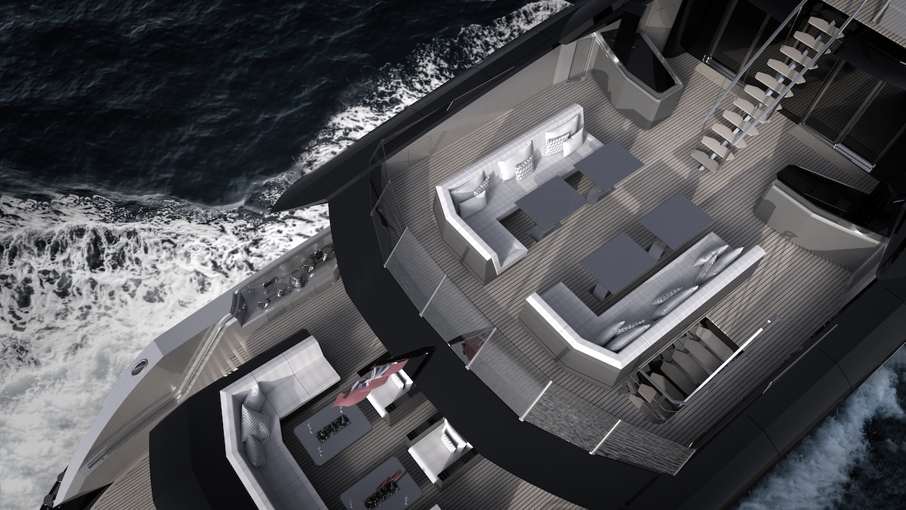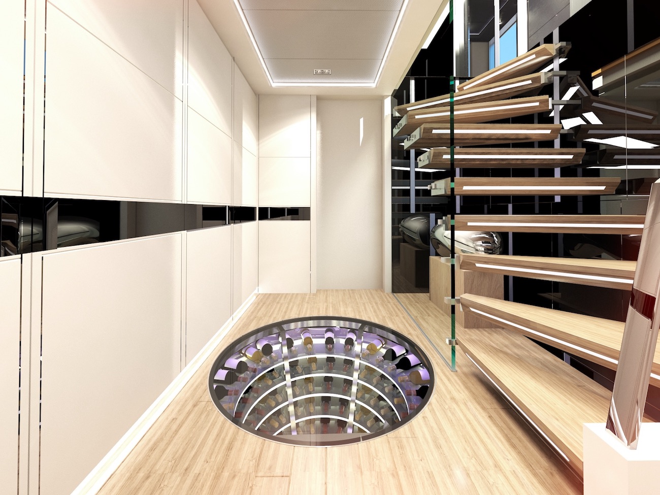 The yacht will also have a unique in-floor wine cellar on the lower deck, fully custom designed with a dual cooling system for different kinds of wine, and tempered glass top with LEDlighting. On the large aft deck fixed swim platform there will be a transformable transom bar, which will provide a truly unique system of swim platform transformation to the beach club.