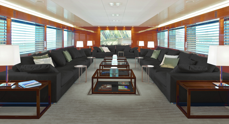 Taking the classic wood panelling look and updating it for the 21st Century, interior designers Vain Interiors have used the bold stripe in walnut wood to add a continuous detail to every room. The main salon has plenty of comfortable sofas and armchairs for hours of socialising in large groups, and the large windows running down each side of the room ensure that there is plenty of natural light from the early hours of the morning right through to the last rays of sunset. As the evening wears on, lighting along the walls and down the centre of the room will keep the space bright and evenly lit, or guests can choose to dim the lights and watch a film together on the widescreen TV. Another smaller adjoining salon to the aft can be separated from the main salon by a sliding door, making a more private setting for smaller groups and turning the space into its own media room.