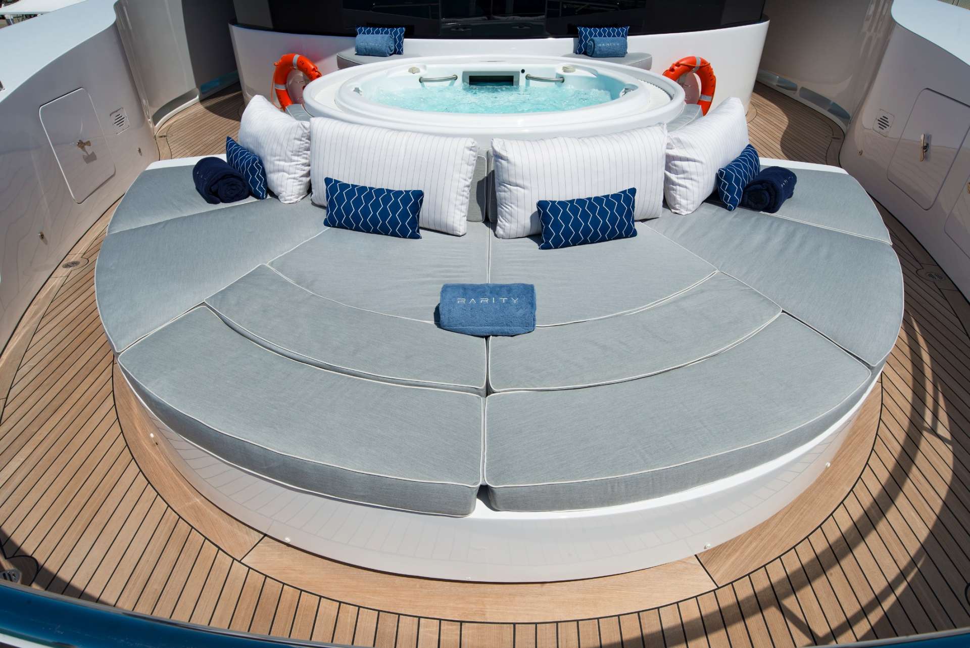 Outdoor living aboard TELAYA spans three impressive decks. The shaded aft deck is ideal for relaxed gatherings, while the bridge deck aft offers alfresco dining and additional lounging space. The sundeck is a highlight, featuring a jacuzzi, generous sunbathing areas, and a fully equipped fitness gym enclosed in glass doors that slide open to welcome in the fresh Adriatic air.