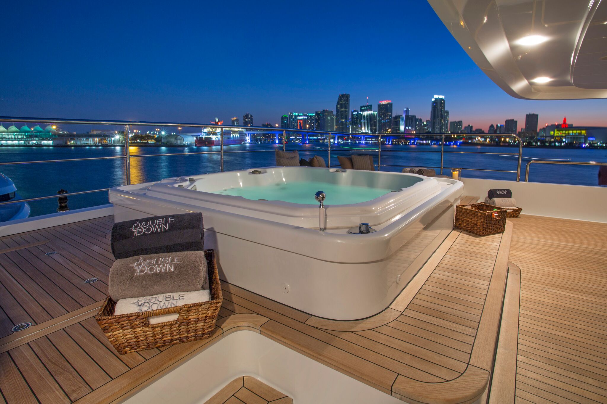 Towering over five decks, 65m/214ft superyacht DOUBLE DOWN is the largest Codecasa superyacht ever built and she is excellent for hosting dockside events or spending extended periods at sea. Her 2016 refitted interiors are timelessly styled and contain a cinema, a massive beach club and a gym, plus accommodation for up to 20 guests.