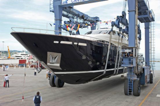 On a sunny, late spring morning Italian yard Custom Line, a member of the Ferretti Yachts Group, launched the first yacht in their 124’ Custom Line yacht model using the travel-lift system at the Ferretti Group facility in Ancona.