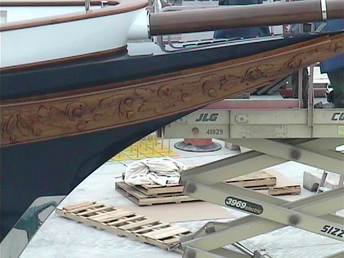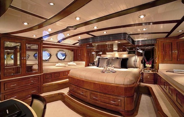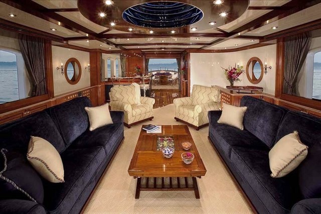The 151 ft megayacht Sycara IV was designed by Bruce King and has intricate period-oriented features aboard such as a trail board hand-carved by Burger’s craftsmen. M/Y SYCARA IV’s interior design by Ken Freivokh and Burger’s in-house team also reflects the 1920s. Her interior features white-painted panels combined with madrona burl panelling accented by ebony inlays and paduak molding which is a red-tone African wood prized for its toughness and carving ability. There is also teak and sycamore flooring balanced by white carpeting in some areas. French doors, Lalique crystal, and other accents throughout further add to the appeal.