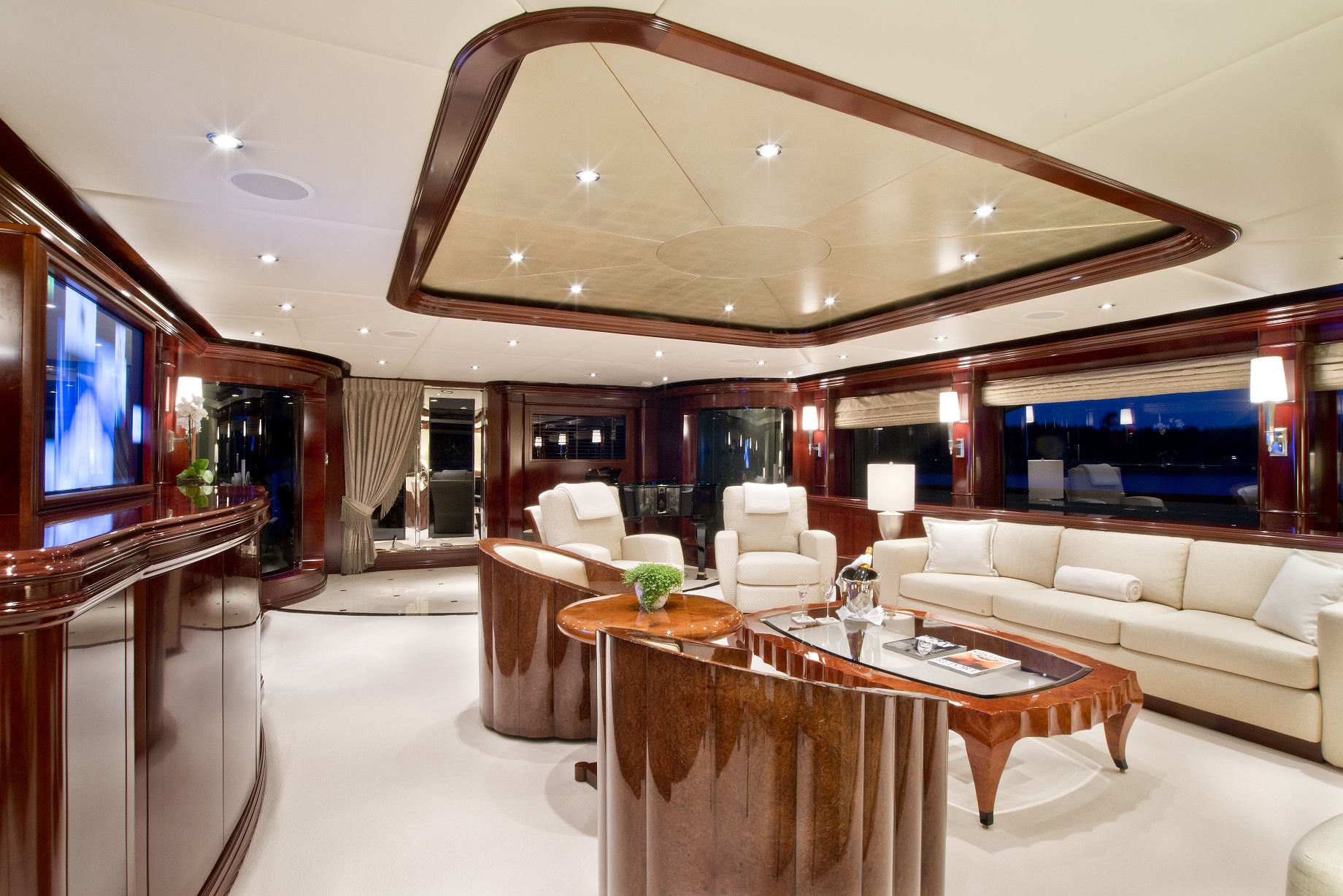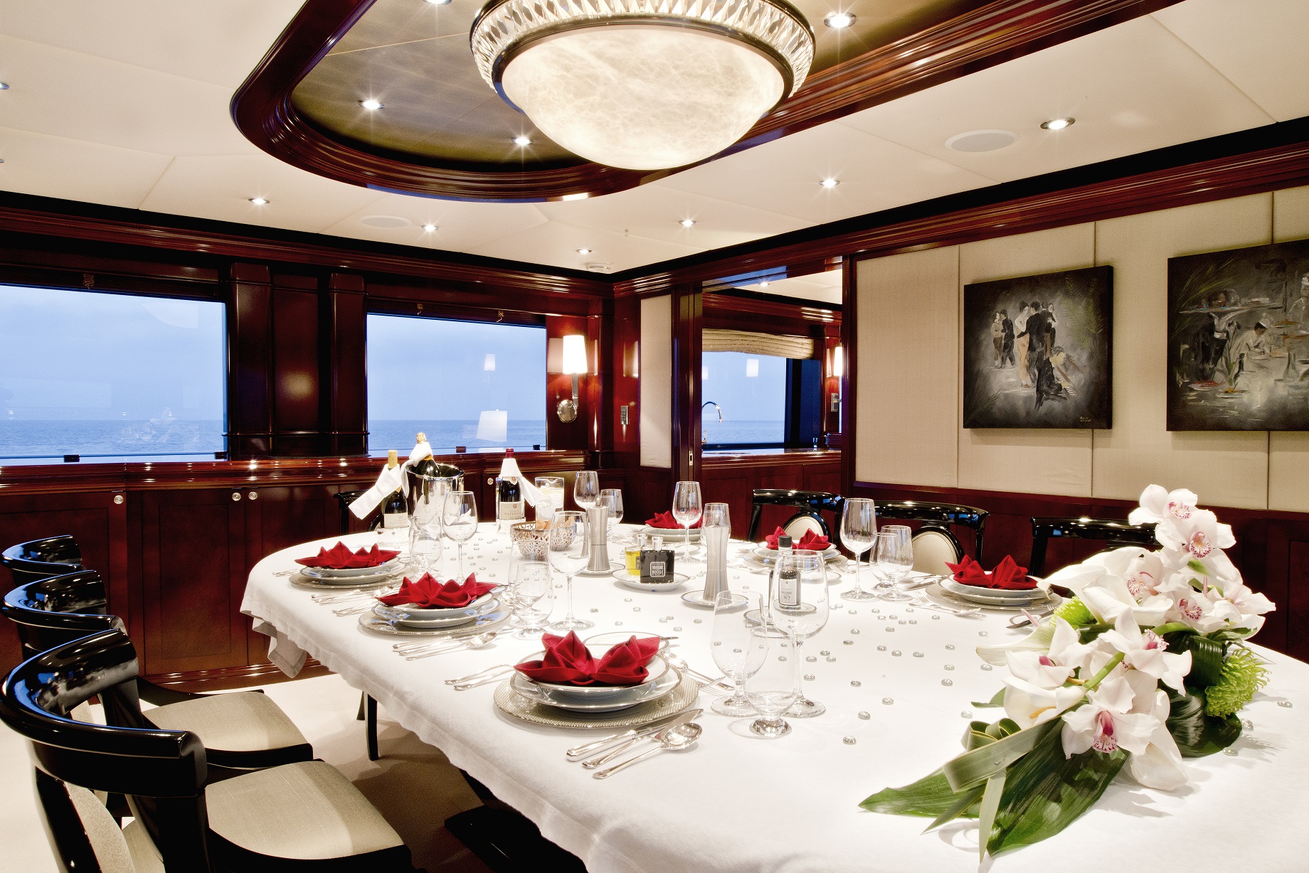On board accommodation is provided to twelve charter guests, including a full-beam master suite located on the main deck, complete with king-sized bed, a private study, his and hers walk-in wardrobes and a huge private en suite bathroom facility with a whirlpool tub and a marble shower.