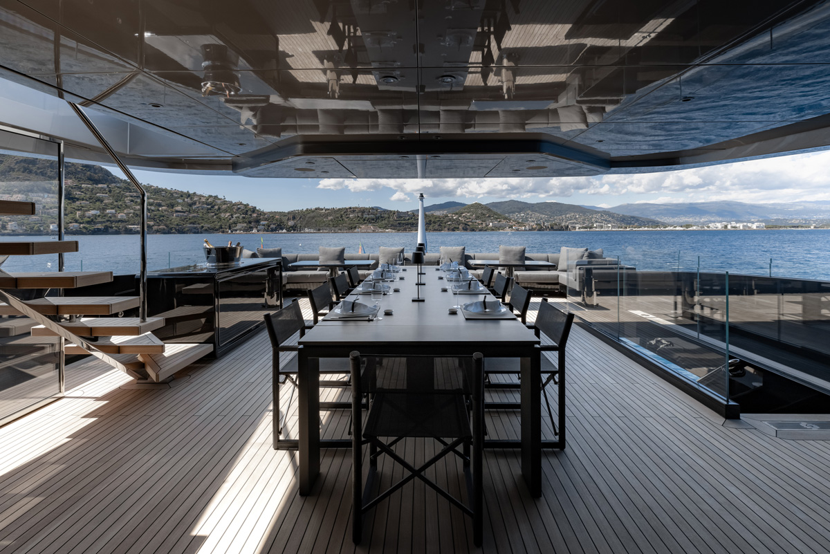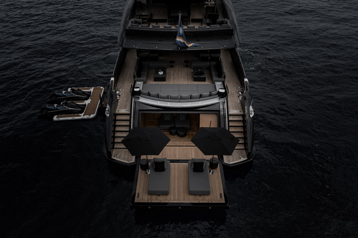 The Owner opted for several changes to the exteriors and interiors, namely the relocation of the formal dining room to the upper deck to dedicate the main deck aft to the main salon, the conversion of the side-loading tender garage in the stern to additional space for the beach club, a private office for the Master suite that can be converted into an extra cabin.