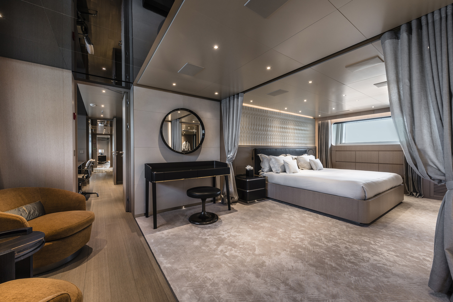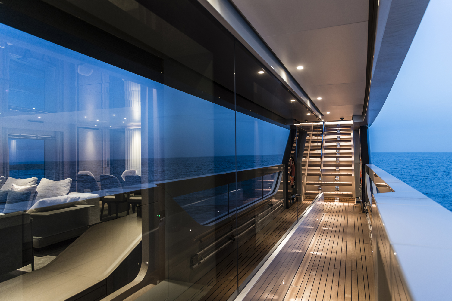 One of the main highlights of KINDA must be her 5,000-litre capacity pool placed on the foredeck and the spacious swim platform at the stern. Huge windows provide excellent indoor-outdoor flow and full enjoyment of the yacht’s surroundings, even when inside.