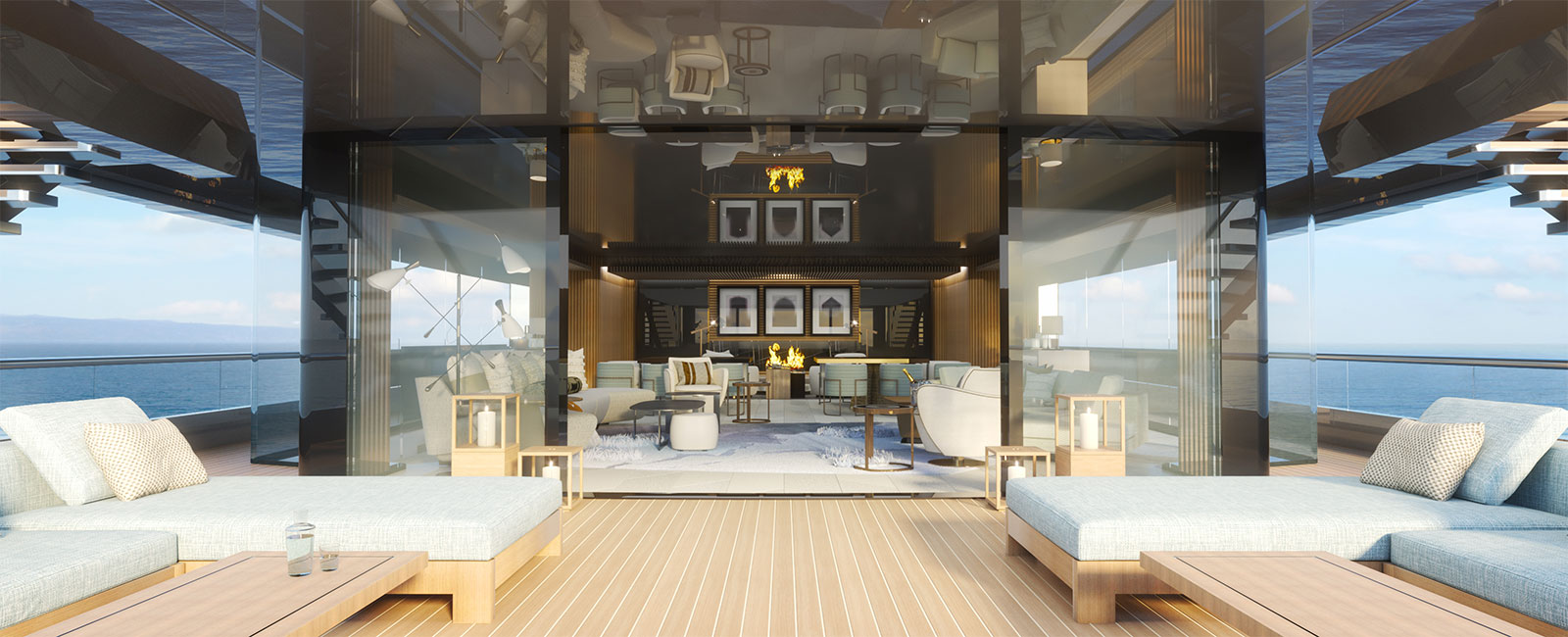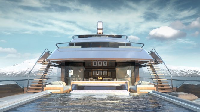 A special feature of the main salon is the fireplace which creates a cosy and comfortable atmosphere onboard. The abundance of glazing used in the exterior does not only provide plenty of natural light but also links the indoor areas to outside spaces. A vast pool area is located on the main deck aft and is suitable for having fun on a sunny day or relaxing watching the sunset. From there, the staircase leads to the upper deck with a bar and sunpads.