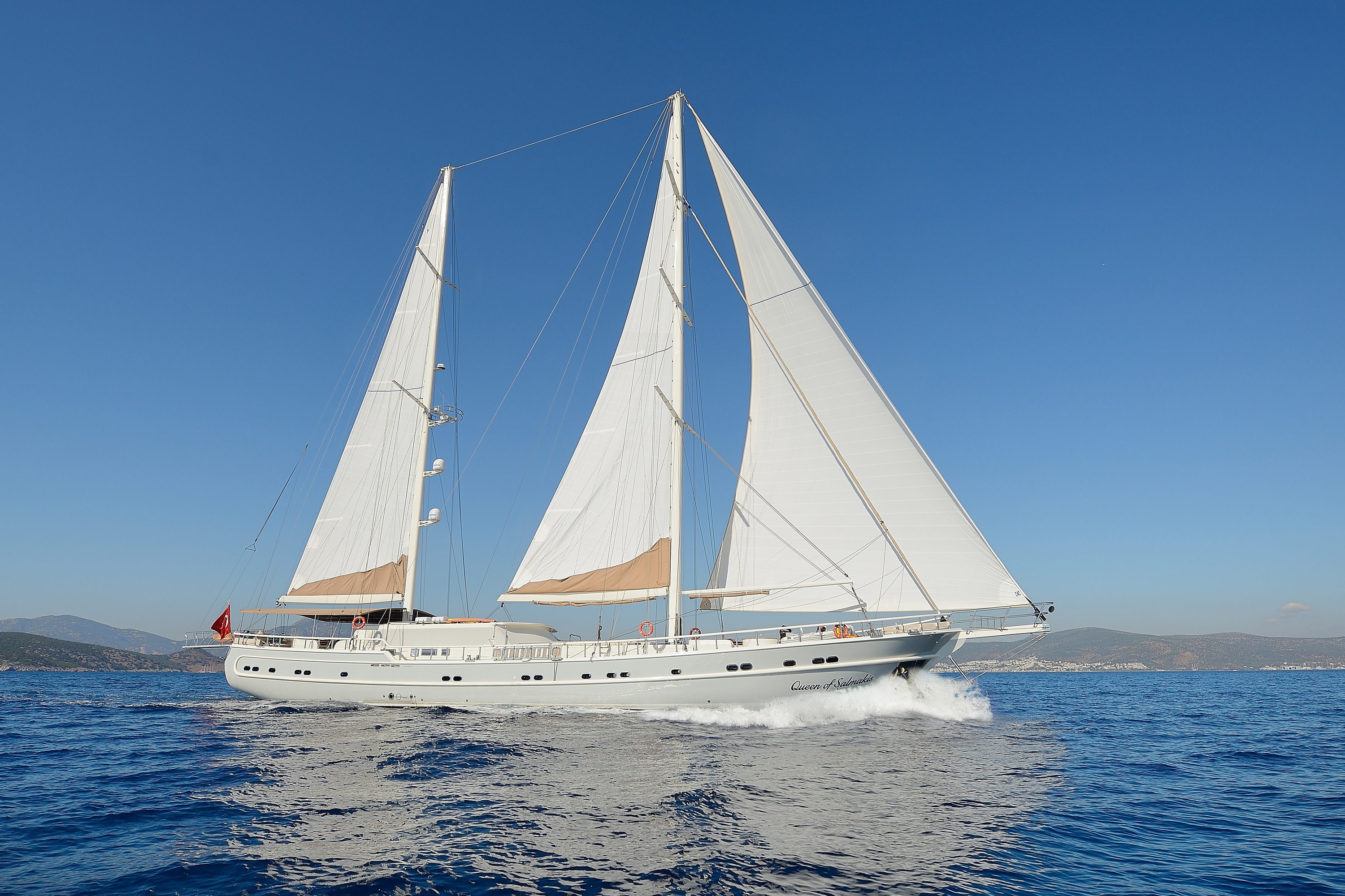 Luxury yacht QUEEN OF SALMAKIS is a sailing gulet based in Turkey perfect for larger groups thanks to her eight ensuite cabins which can accommodate up to 18 guests. Add to this, her foredeck jacuzzi, spacious al fresco dining and sunbathing areas and you have the recipe for a perfect charter vacation.