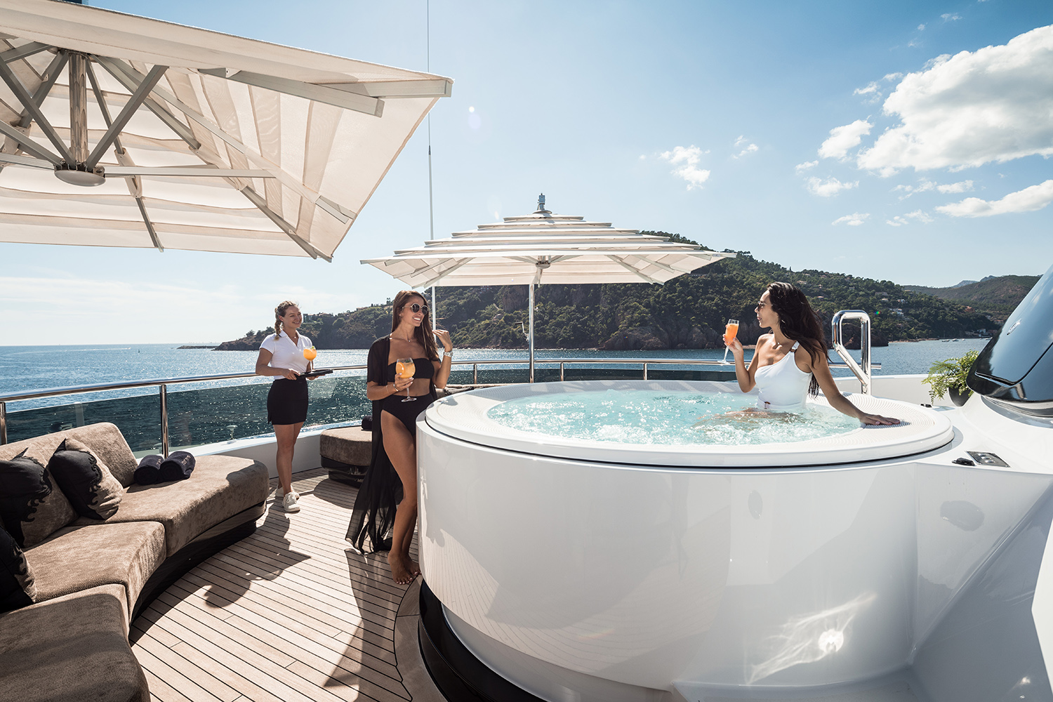 At the heart of many superyacht sun decks lies the pièce de résistance – a bubbling jacuzzi – the perfect place to relax surrounded by the vastness of the open sea or the natural beauty of a secluded cove. On the biggest and best superyachts, a jacuzzi is a masterpiece of design and engineering, crafted from the finest materials featuring underwater lighting, massage jets and waterfalls creating the very best experience imaginable.