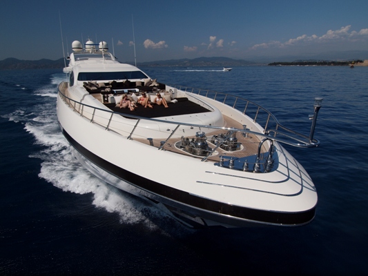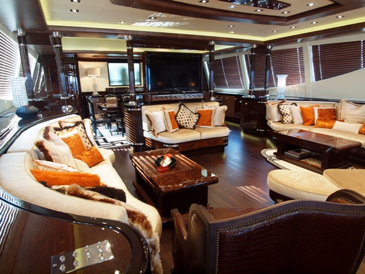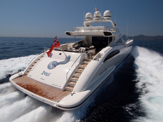 Though PURE ONE is huge for a sports yacht, the Mangusta 165 superyacht ZEUS is in fact currently THE largest open style sport motor yacht in the world. Yacht Zeus has a wonderful aft deck and foredeck arrangement, complete with heated Spa Pools pool which can alternate as a sunbathing pad. In addition, the elegant interior of luxury yacht ZEUS is also well concieved and it features neutral fabrics and dark woodwork and a spacious main salon area.