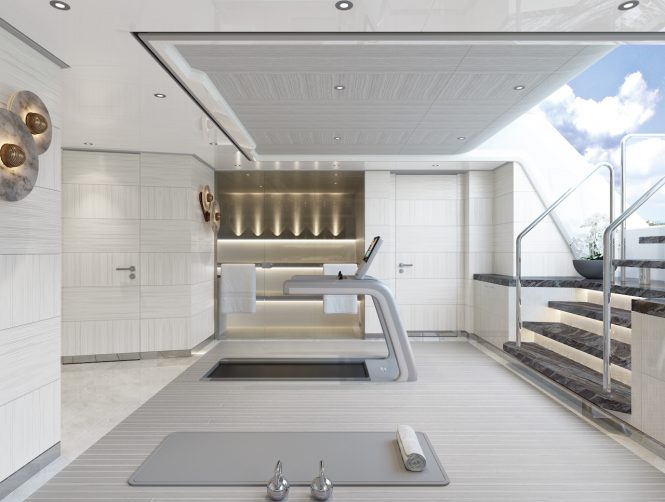 Among the on board amenities is a massive sundeck and swim platform, a balcony off the Owners’ suite and an interior volume of 830 GT. A 9m/29.5ft tender is stored on the foredeck, which also has plenty of room for alfresco dining or sunbathing.
