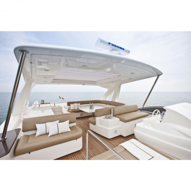 The spacious cockpit features teak flooring, and is furnished with a large sundeck bench with reclining back which can be transformed into a seat for the table, complete with small armchairs. Access to the flying bridge is provided by the stairway on the right, where there is a large dining area with a U-shaped table, grill area and fridge, whilst towards stern there is a large sundeck. The crane permits housing of the tender, for which there is a special space on the fly. At bow, on the left hand side, there is the external steering position, raised to guarantee better vision. To the right is another sundeck and the stairway to the salon. Ferretti 800 is available in a hard top version, too with a sliding, electrically opened awning. At bow on the main deck, Ferretti 800 features an alternative, highly comfortable living solution, typical of maxi yachts: besides a large sundeck, a spacious, semicircular area has been created, furnished with a large table and seating, where owner and guests can relax in complete privacy.