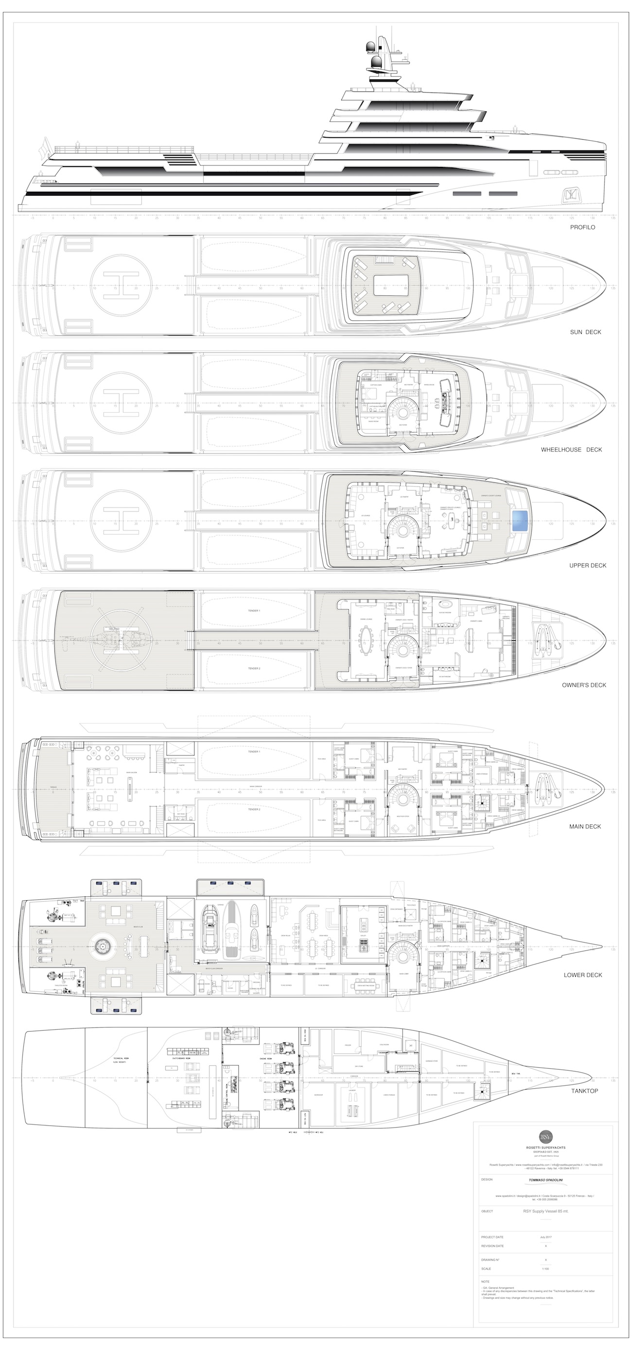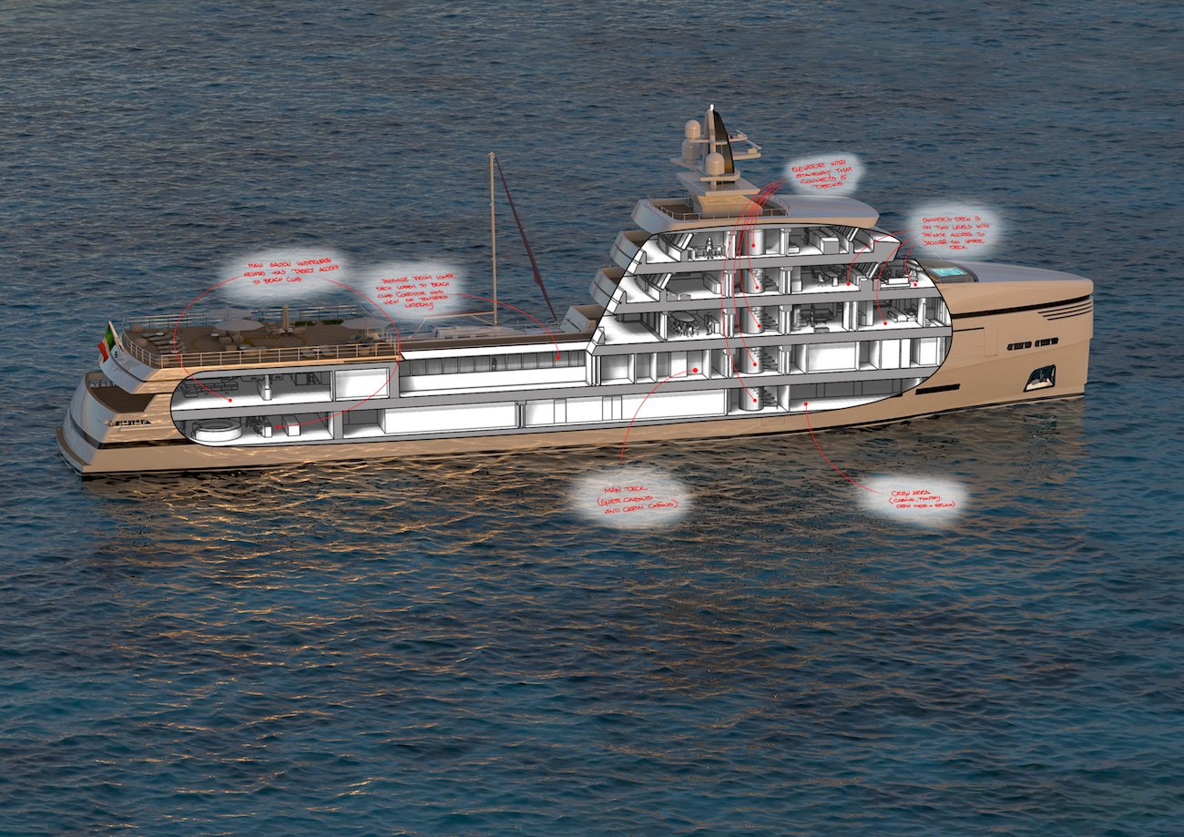 Yacht designer Tommaso Spadolini has disclosed details on his 85m/279ft support vessel concept for Rosetti Superyachts.