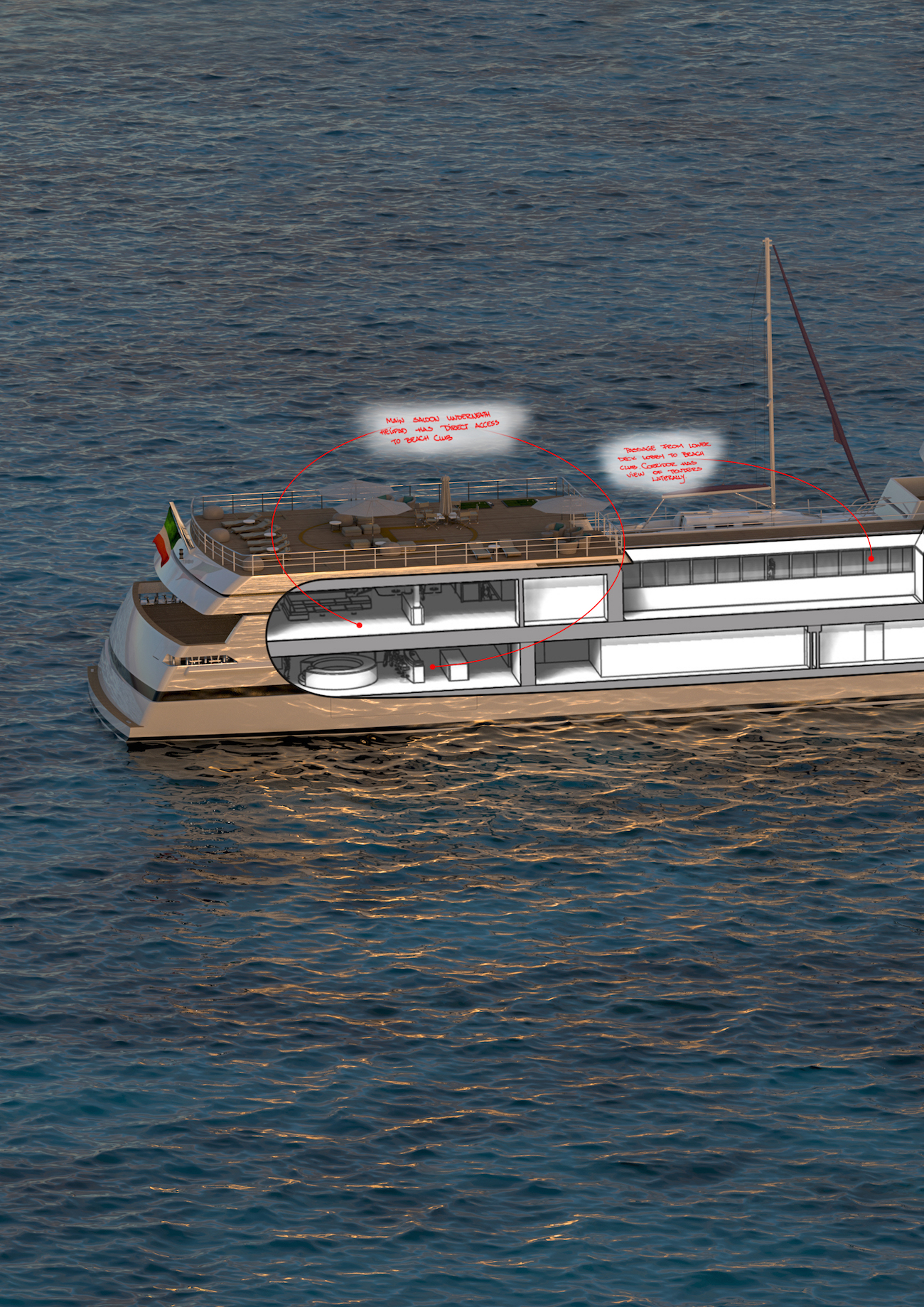 “Despite the large deck areas dedicated to storage for tender and toys, I was able to develop a vessel with a volume of over 2,000 gross tons split between the forward superstructure and aft guest area below the helipad,” Spadolini continues. “Connected by an open and covered walkway, this is a unique arrangement on a yacht borrowed from certain working vessels.”