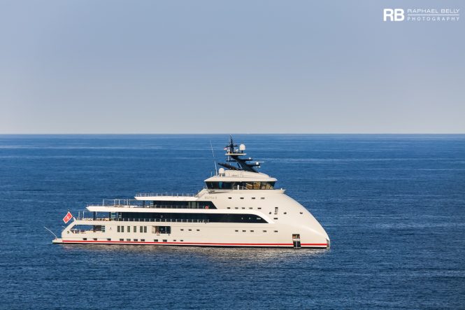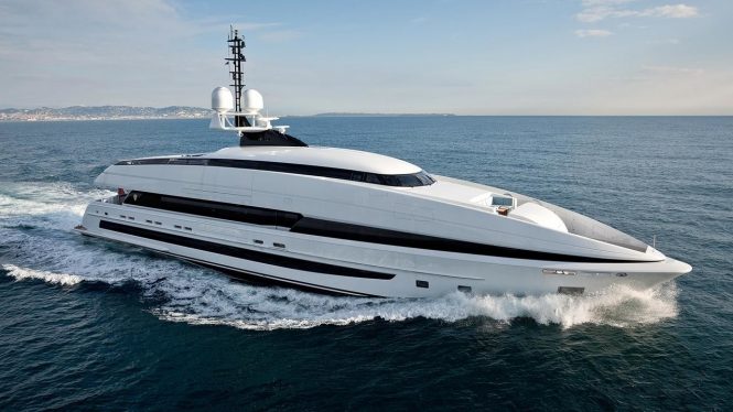 This 80m/262.5ft superyacht with exterior styling from Winch Design features a swimming pool, a sundeck and Owner’s deck Jacuzzi outside, and a beach club and a two-tier spa with a sauna and gym within. There’s accommodation for up to 12 guests across 7 en-suite cabins, plus a crew of 22. T