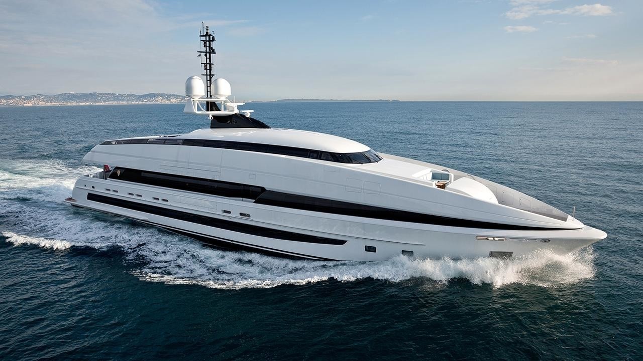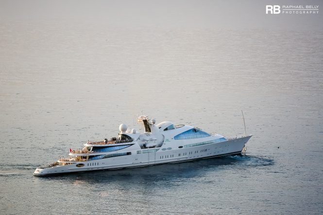 Mega yacht YAS is a striking white vessel boasting dome-like curves and two-tone windows that change from dark grey to brilliant blue depending on how they catch the light. She is one of the world’s largest motor vessels at 141m/463ft, and was built from the 1970s Dutch naval ship HNLMS Piet Hein. Today, she cruises with a crew of 56 and up to 60 guests, who have at their fingertips an outdoor spa and swimming pool, a helipad and top-notch entertainment systems for filling the time on transatlantic journeys.