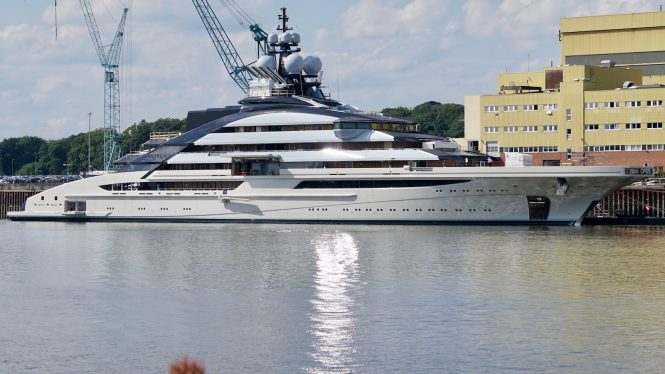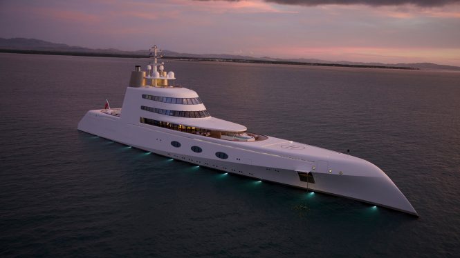 The 2016-launched luxury yacht A is a motor-sailer of impressive proportions, measuring 142.8m/469ft and setting a trend for mega yachts to come. Her avant-garde appearance comes from Philippe Starck, and the white hull and superstructure is made to look seamless by having the windows glazed in the same colour. Even the fold-down sections are designed to look as inconspicuous as possible, and the eye is drawn to the tiered, sloping aft decks and the three majestic masts.