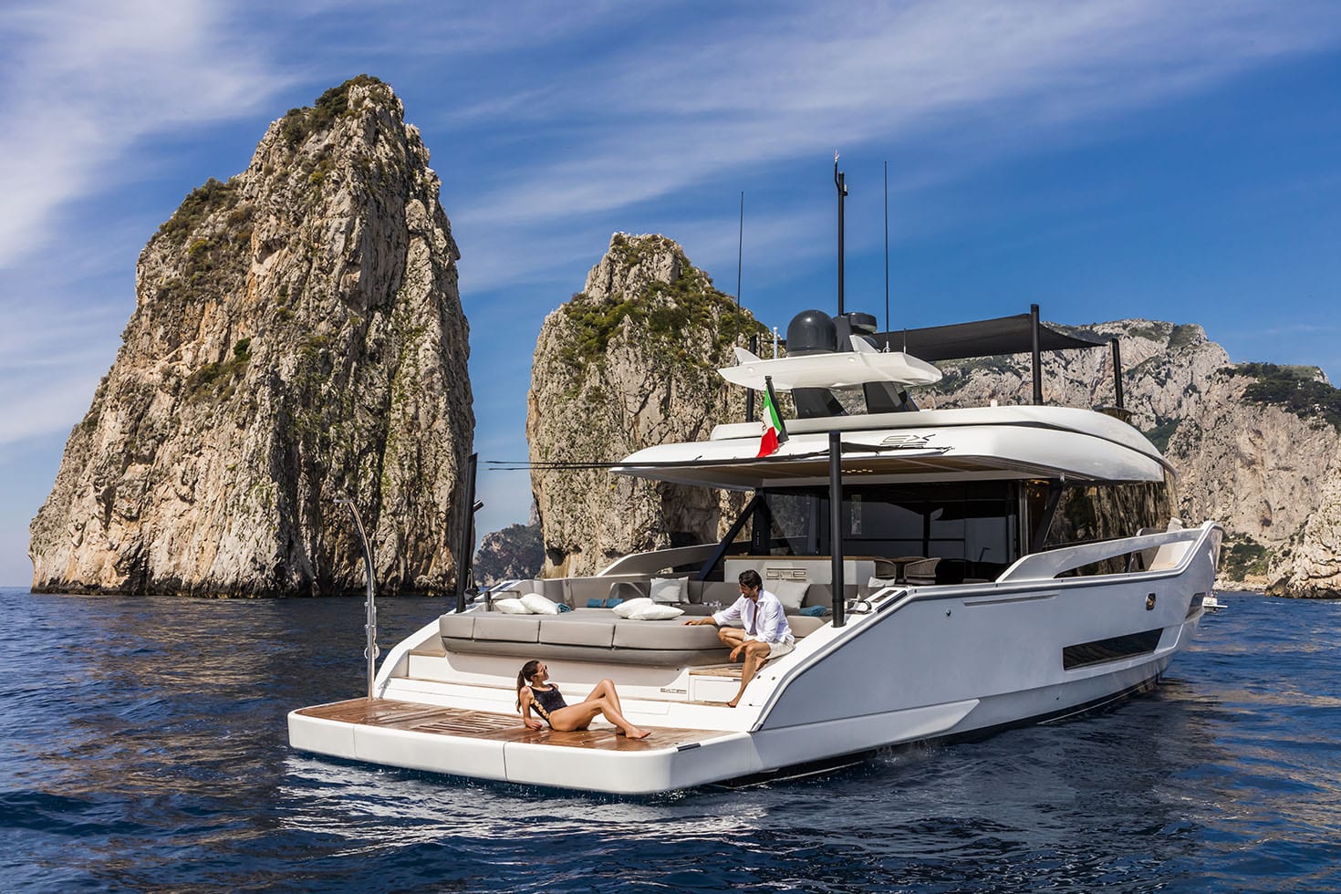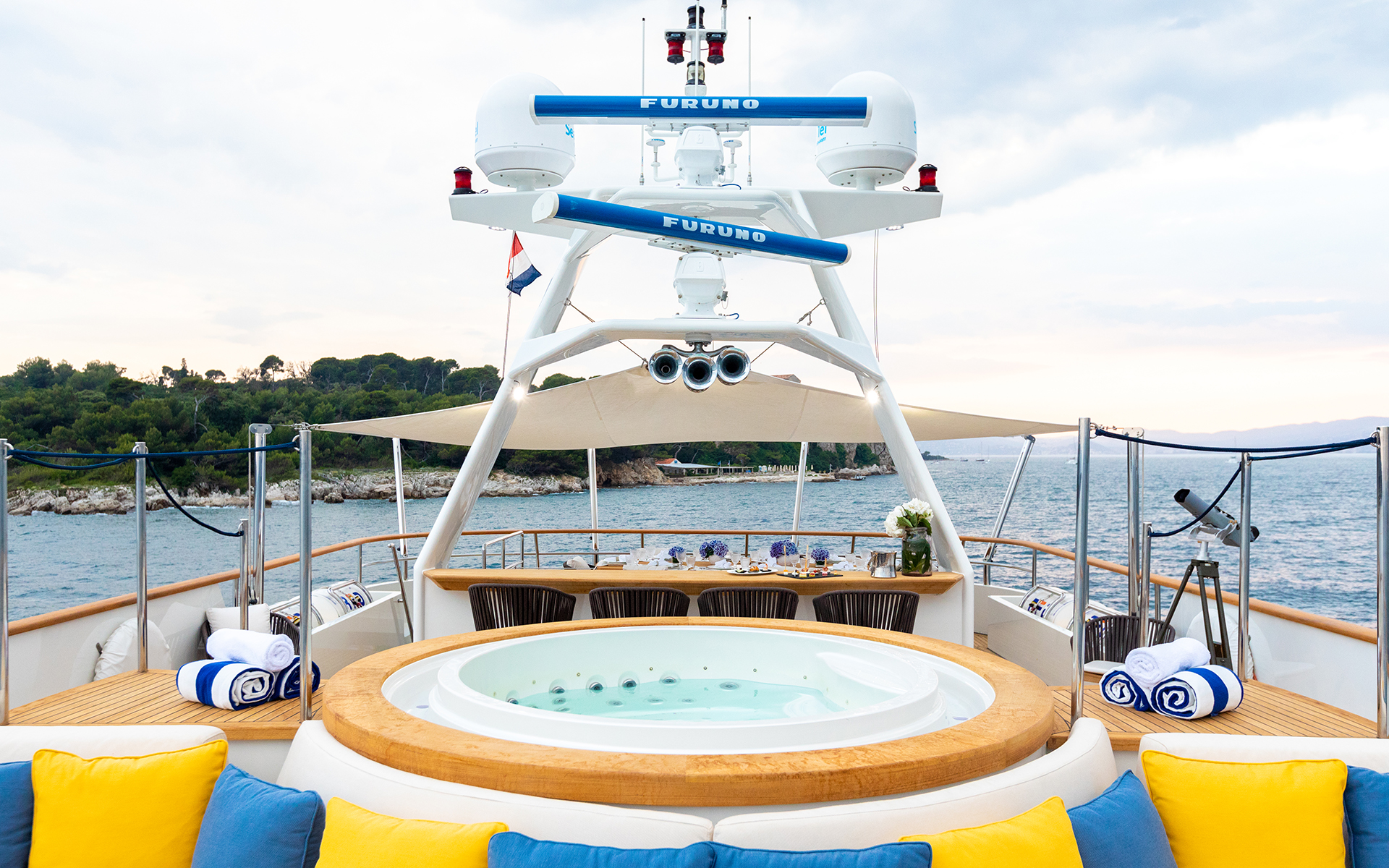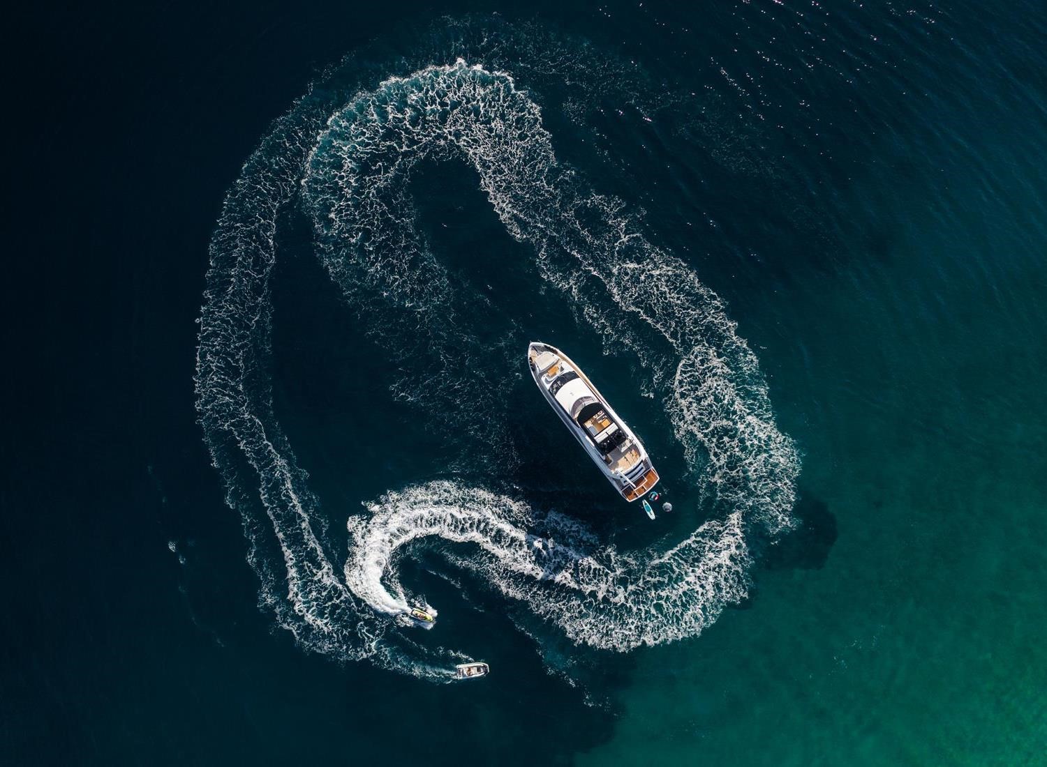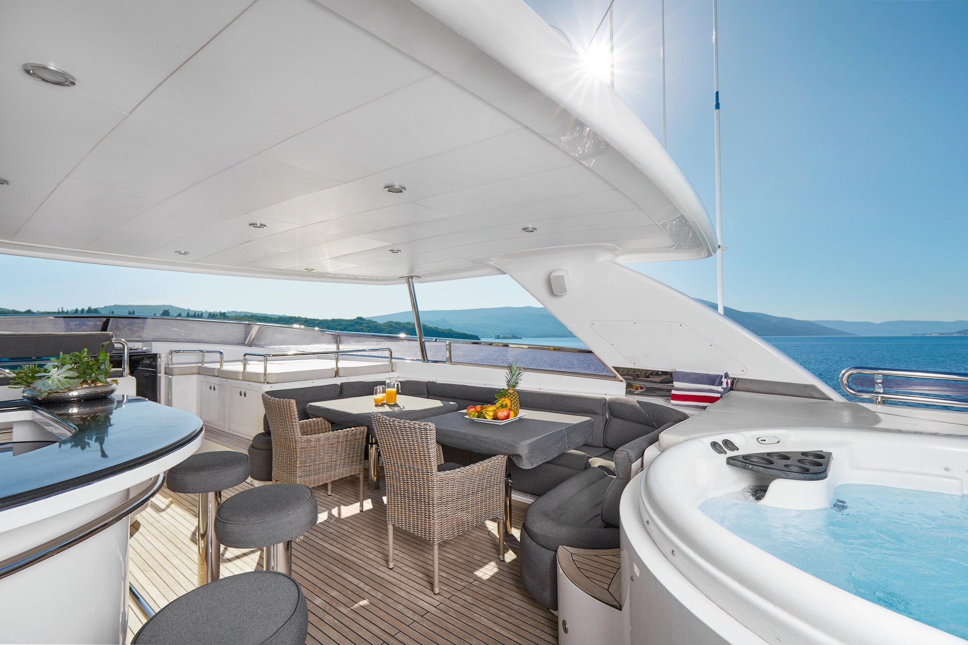 Take in the views from the shaded flybridge as you cruise from one hot spot to the next, and relish the Jacuzzi and sunpads following a fun and tiring time trying out the jet skis and inflatable and towable toys.