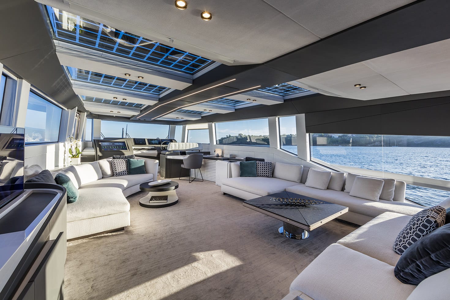 Up to eight guests are accommodated in four en-suite cabins, and they will wake to a light-filled room thanks to large windows in the modern design. The main deck lounge provides an excellent connection to the local environment, continuing the liberal use of glass and the open aft section connects to an alfresco lounge for uninterrupted indoor/outdoor flow.