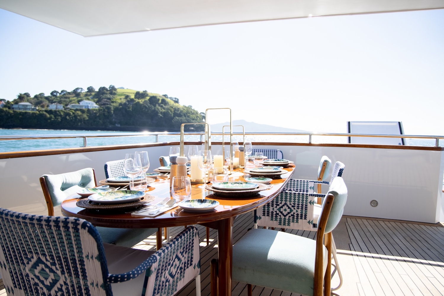 Beautiful breakfast set up aboard motor yacht SEA BREEZE III available in the South Pacific and French Polynesia