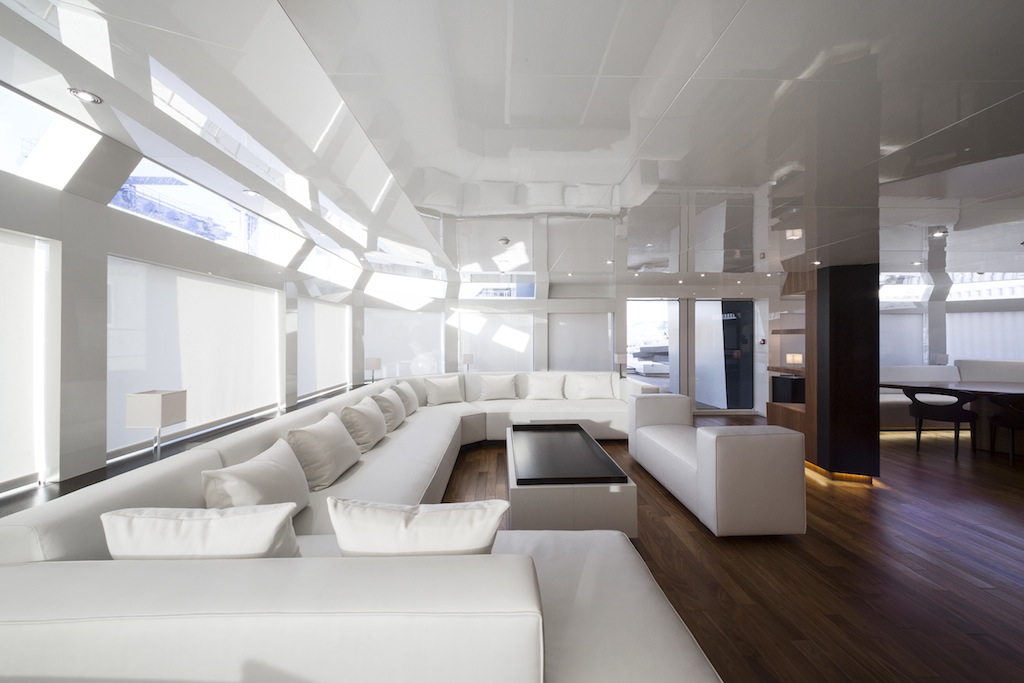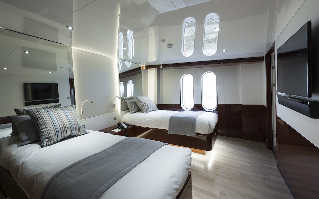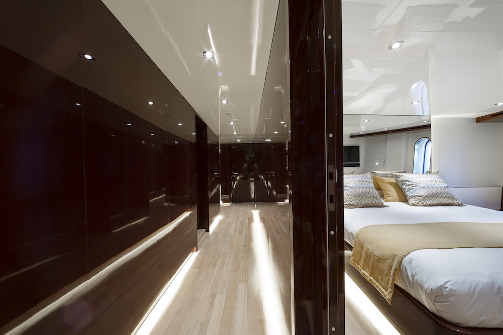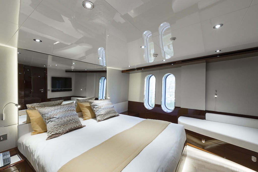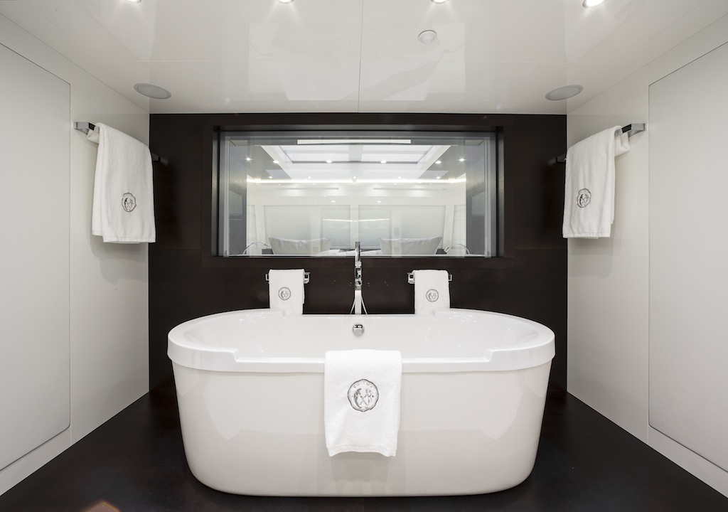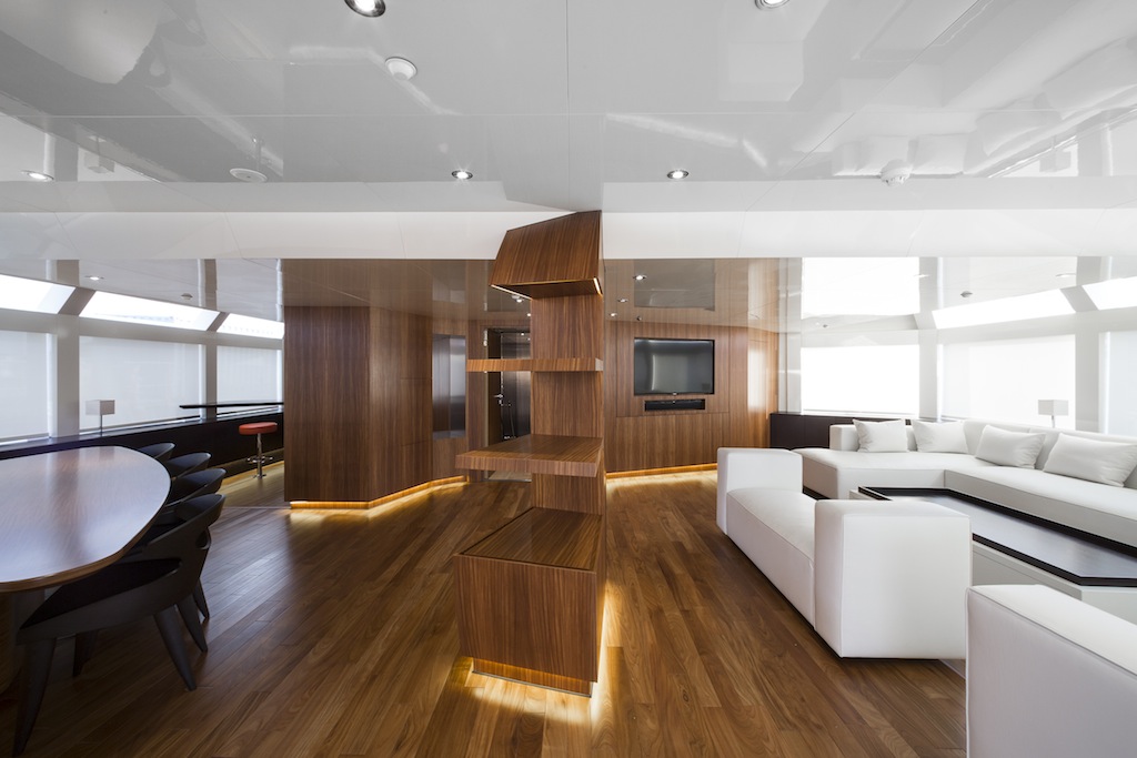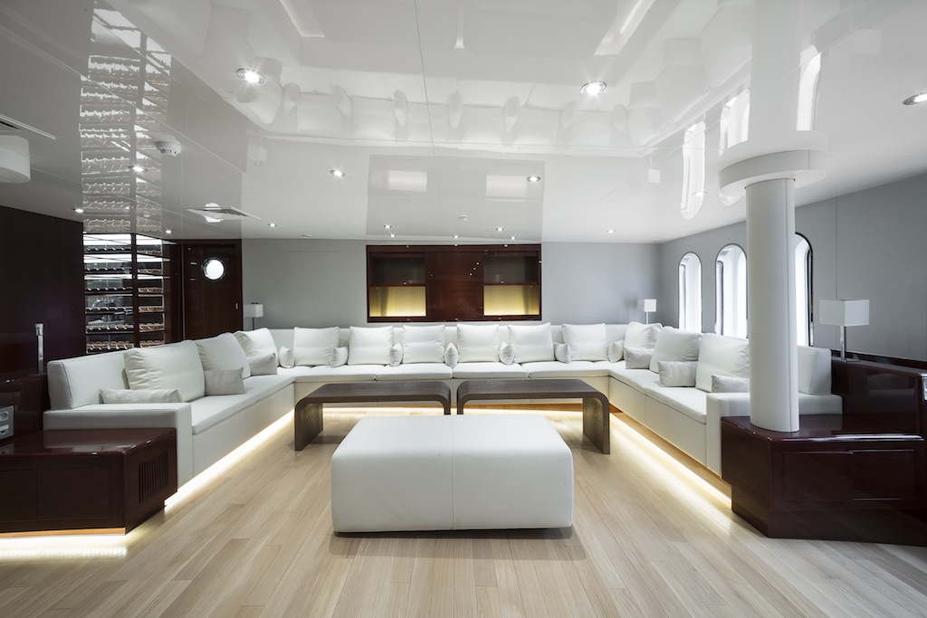 A marine look with a slightly modern touch has been achieved on board. Each cabin is subtly themed for a particular continent. The main deck palette includes wine tones, bright berries, fiery oranges and browns. Those colours change to whites and taupe at the upper deck level. Vitruvius Yachts did an excellent job. The end result that well exceeded Owner’s expectation.