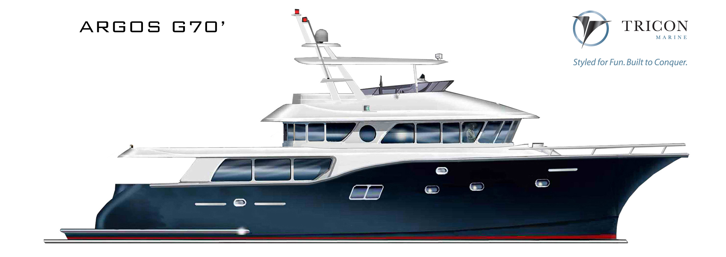 The Tricon motor yacht G70 includes crew quarters for two. The custom-built Argos G70 superyacht will be fitted with CAT C-12 715 HP engines. Tricon Marine expects a cruising speed of 17 knots and maximum speed of 20 knots, with a range of over 2,000 nautical miles at passage-making speeds.