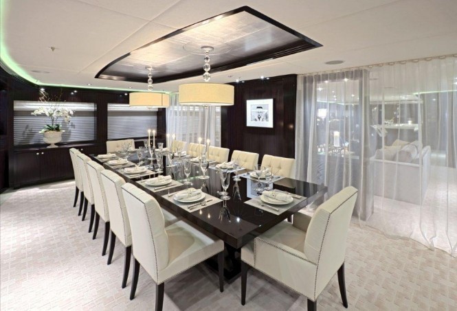 Carol Williamson’s touch is evident throughout the interior, it is rich with the masculinity of hand-wrought hard woods and urbane with the femininity of light soft goods and stylish accents. While yacht Carpe Diem ‘fully incorporates the careful play of architecture, light and complex sophisticated colour’ CW+A is widely recognized for, she also boasts tremendous living space featuring a magnificent main salon, expansive dining salon, main aft deck with wet bar and air conditioning, dual staircase to her extended swim platform and passerelle—which even includes modular furniture—a full-width sky lounge, upper aft deck, Portuguese bridge and sun deck.
