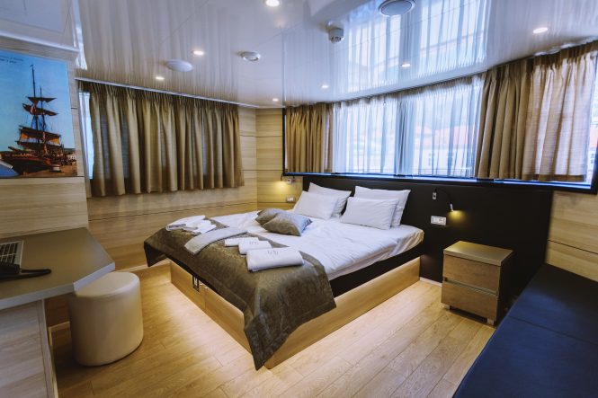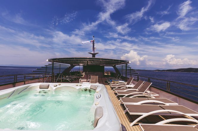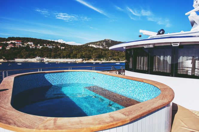The lavish outdoor sun deck includes comfortable sun-beds, a small plunge pool, deluxe Jacuzzi and outdoor bar, all perfectly placed for unwinding and cooling down during the hot summer days. The swim platform provides easy access to the water for the opportunity to enjoy a selection of water toys.