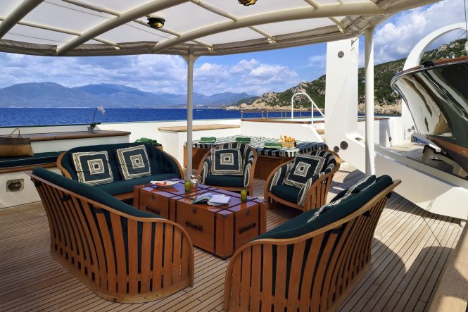 Outside, there is plenty of choice for alfresco dining and lounging, and the furnishings match the interior for quality and comfort. The aft deck area boasts a large sunbed and generous raised Jacuzzi for relaxation as you marvel at the snow-capped mountains of Greenland, the dense forests of Canada or the picturesque Cornish coastline.