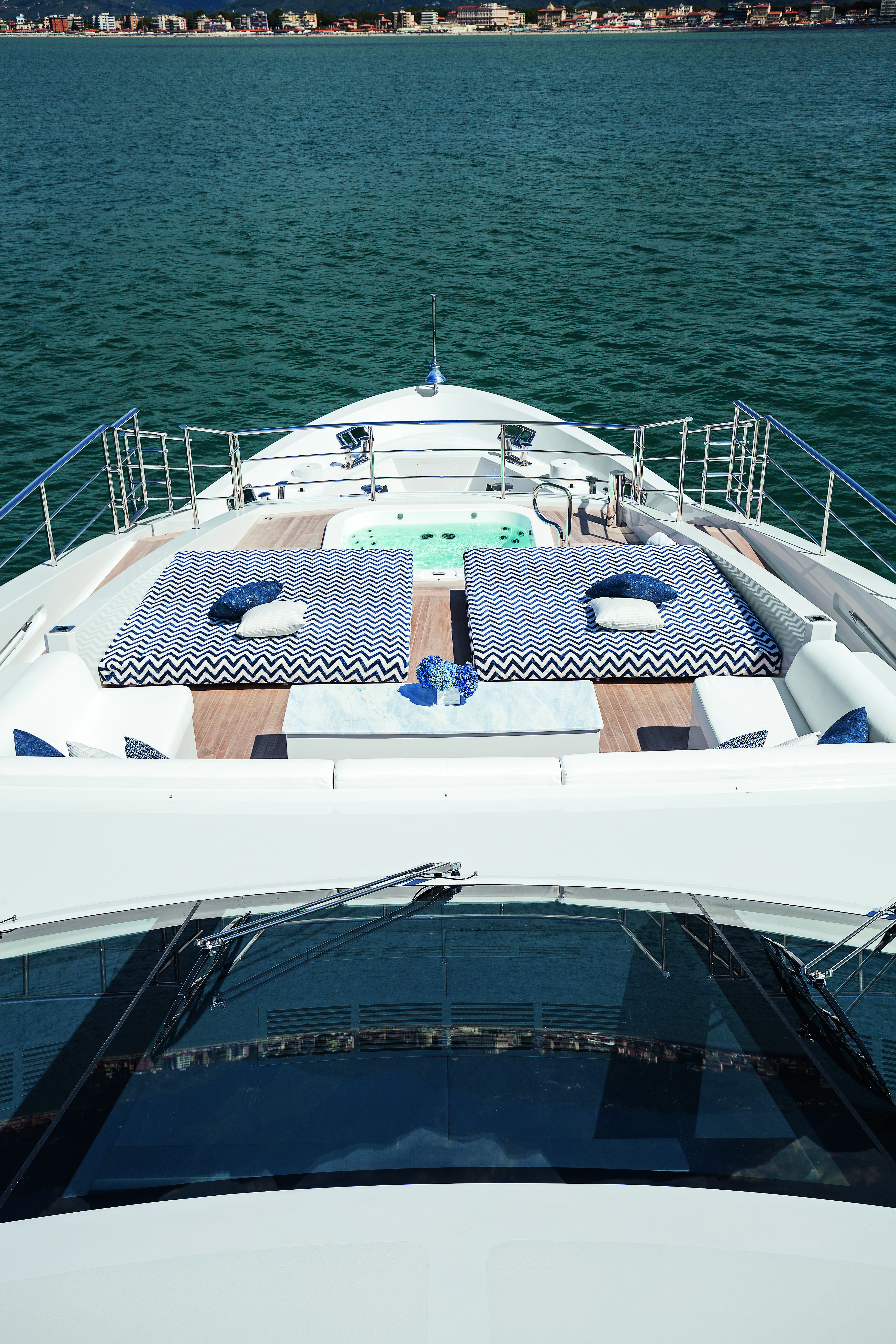 Forward of the lounging area are two enormous sunpads that are generously deep for a comfortable rest. The Jacuzzi is inlaid into the deck at the very front for easy access entering and leaving its powerful jets. Here, guests can enjoy 180 views of one of the world’s most popular charter grounds.