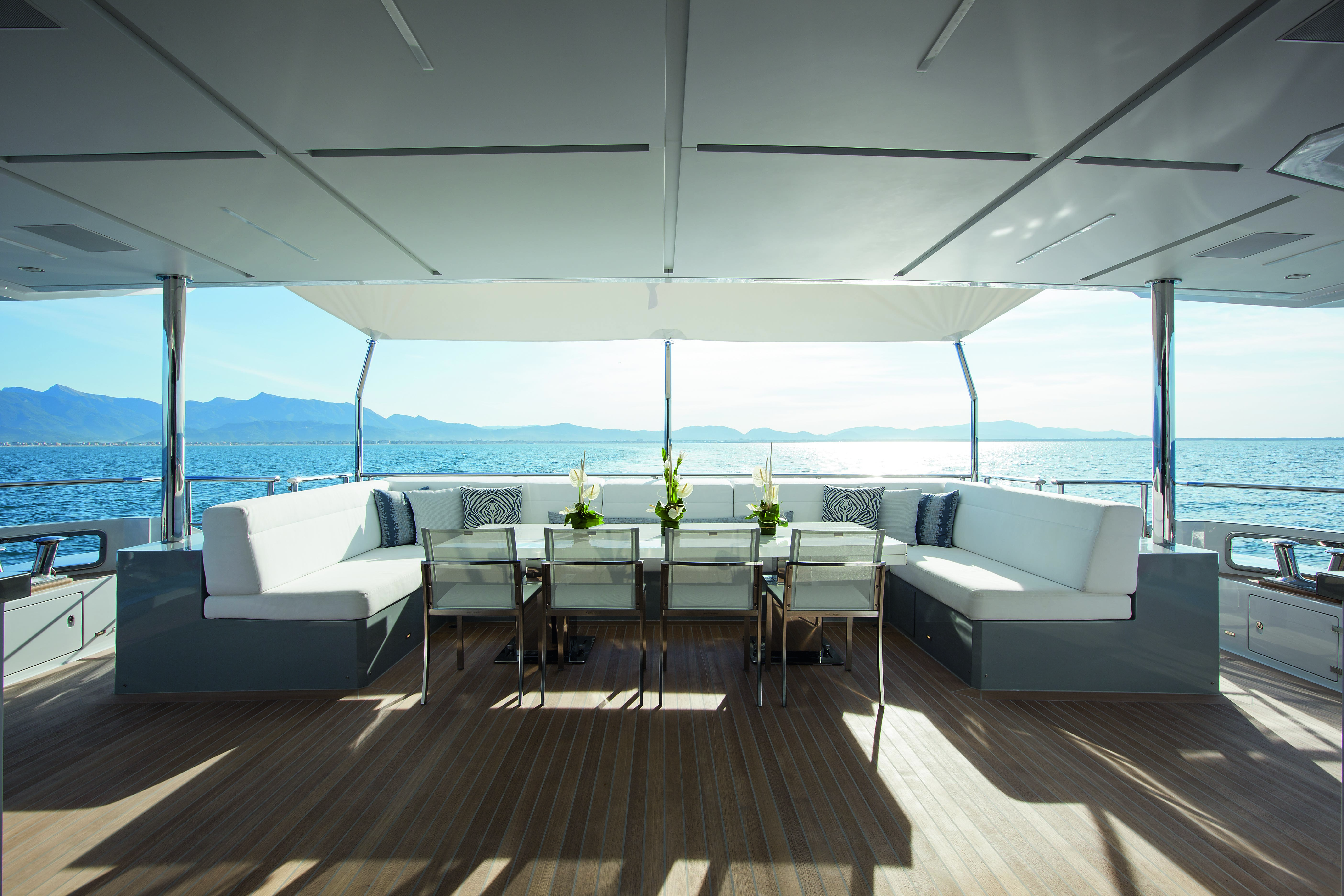 Guests will find dining for two in the salon interior perfectly located to enjoy port-side views of the beautiful Bermuda landscape, from pink beaches to towering lighthouses alternatively, there are a number of options for dining on board and the main deck aft has a removable canopy to shade guests eating outside on the comfortable sofa. The area is an excellent space for restful moments outdoors and when anchored at your remote Bahamas beach, the extendable beach club becomes the perfect space to sun lounge beside the lapping water.