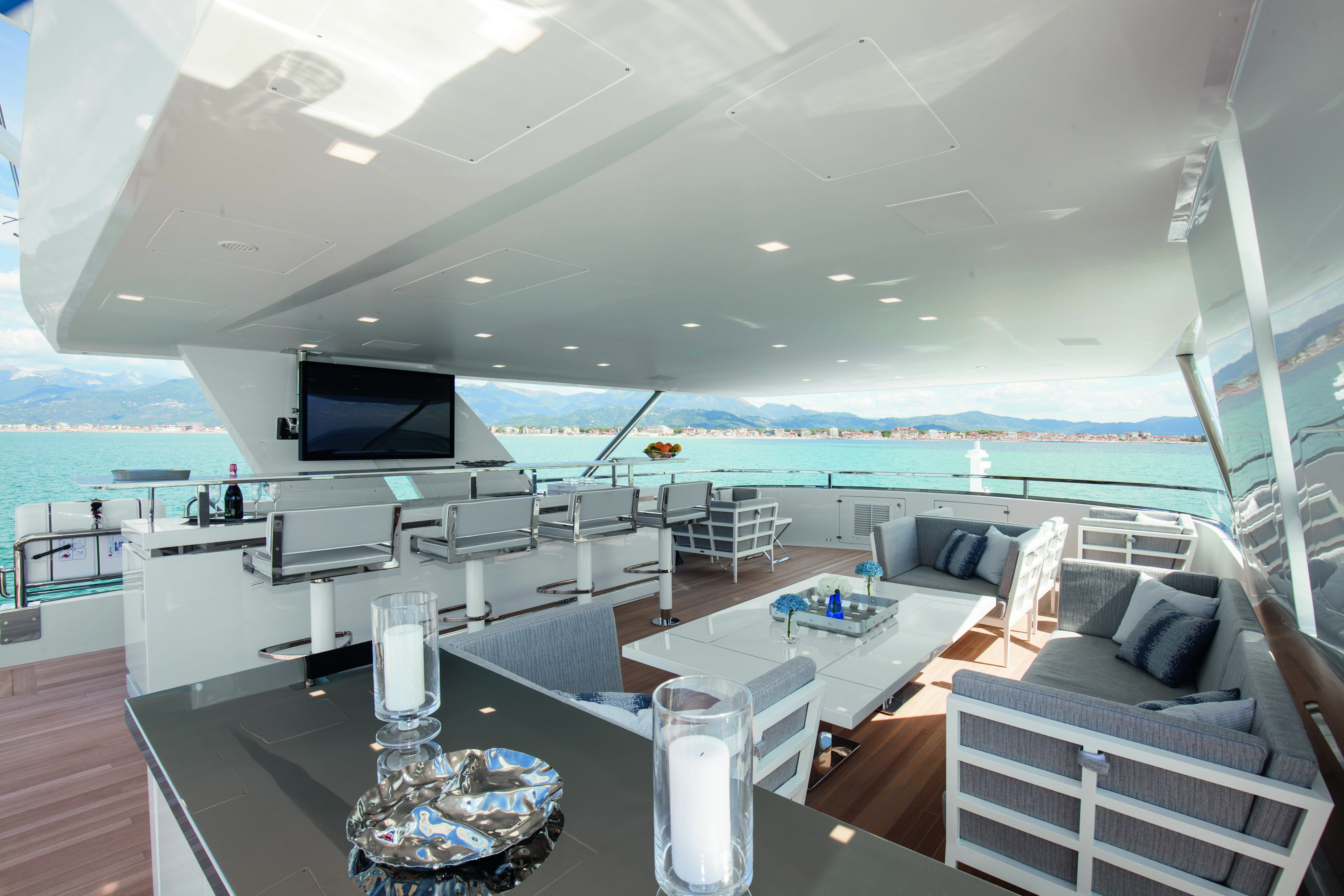 When you and your guests need refreshments, the skylounge has a bar with a great selection on offer to accompany your evening meal at the formal dining table, or while watching a film on the impressive TV. The upper deck aft seats 8 guests in for a meal with friends and family under the colours of a tropical sunset. A seating area beside the aft balustrades will give guests the enviable opportunity to take in the picturesque islands of Bermuda and the Bahamas surrounded by transparent reef-filled waters.