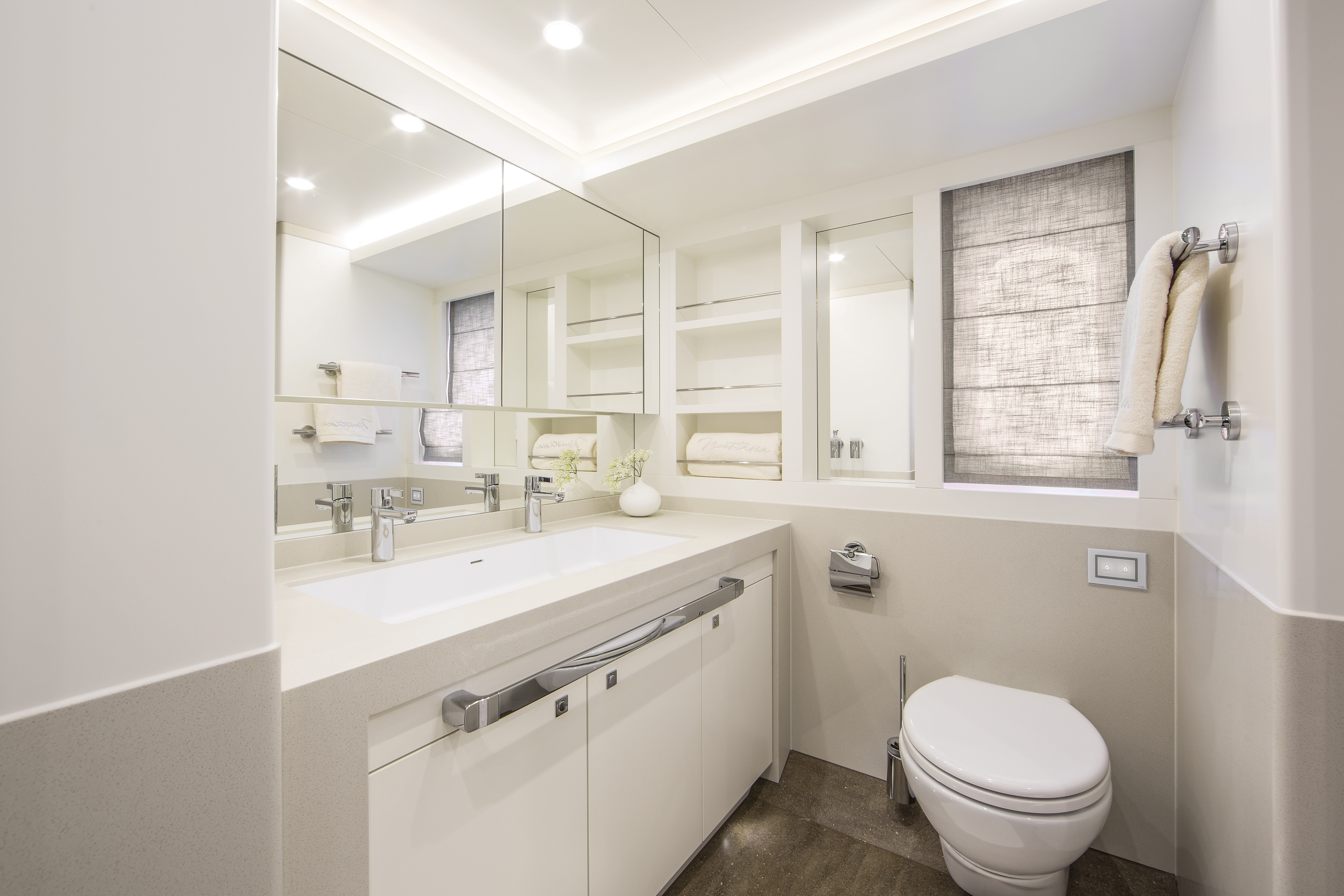 On the lower deck the Master suite takes advantage of the full beam amidships, while the VIP stateroom is placed in the bow and between them a double cabin and bunk cabin for children, all with en-suite facilities.