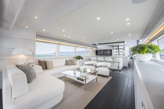 The main deck cockpit is fitted with a sofa and additional chairs surround a raised table for alfresco dining and outdoor living in the shade. A port staircase leads to the flybridge, where the tenders and motorised water toys are stored along the aft and the central section beneath the hardtop contains a C-shaped sofa with tables for alfresco dining and drinks, and forward there are two sunpads either side of the helm station. Additional sunbathing space can be found on the foredeck where sunpads cover the section in front of the raised pilothouse.