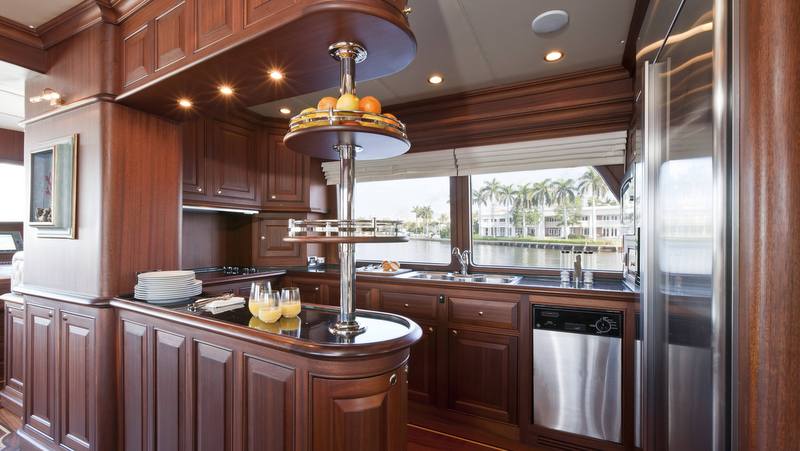 – Main deck: oversized salon with built-in seating, wet bar, full-length galley, elevated dining room (seating for 8), and wheelhouse