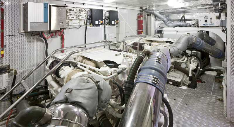– Flybridge: fully equipped helm station with two Stidd double helm seats, hydraulic dining table for 15, large grill, wet bar, sun deck and Spa Pool